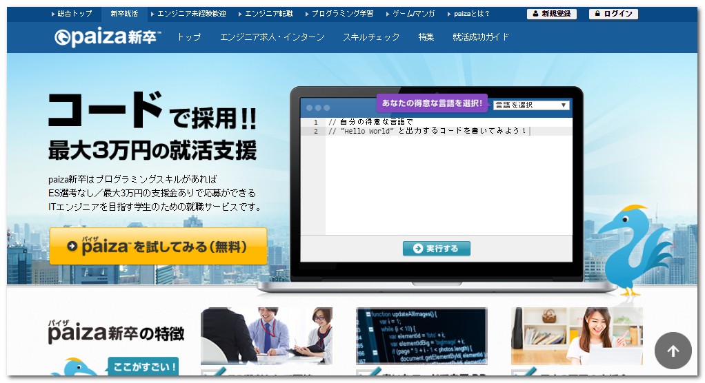 「paiza新卒」は、ITエンジニアを目指す人たちのための、IT/Webエンジニア求人に100%特化した就職サービスです。プログラミングスキルチェック(コーディングのテスト)を受けて、スコアが一定基準を超えれば、ES選考なしで複数の企業へ応募ができます。