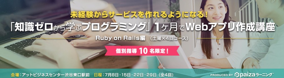 paizaはこのたび「知識ゼロから学ぶプログラミング」1か月でWebアプリ作成講座:Ruby on Rails編として、土曜×4回コースの個別指導型プログラミングスクールを開催いたします。「これからプログラミングを学びたい」「Webサービスを作れるようになりたい」といった初心者向けの個別指導型・短期集中のプログラミング学習ブートキャンプです。