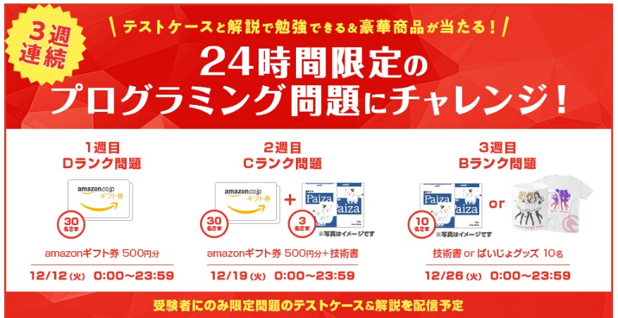 paizaでは、12月12日(火)より、3週連続で毎週火曜に24時間限定スキルチェック問題を出題しています。次回は12月19日(火)です!