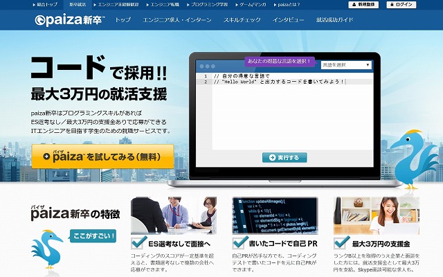 「paiza新卒」は、ITエンジニアを目指す人たちのための、IT/Webエンジニア求人に100%特化した就職サービスです。プログラミングスキルチェック(コーディングのテスト)を受けて、スコアが一定基準を超えれば、ES選考なしで複数の企業へ応募ができます。