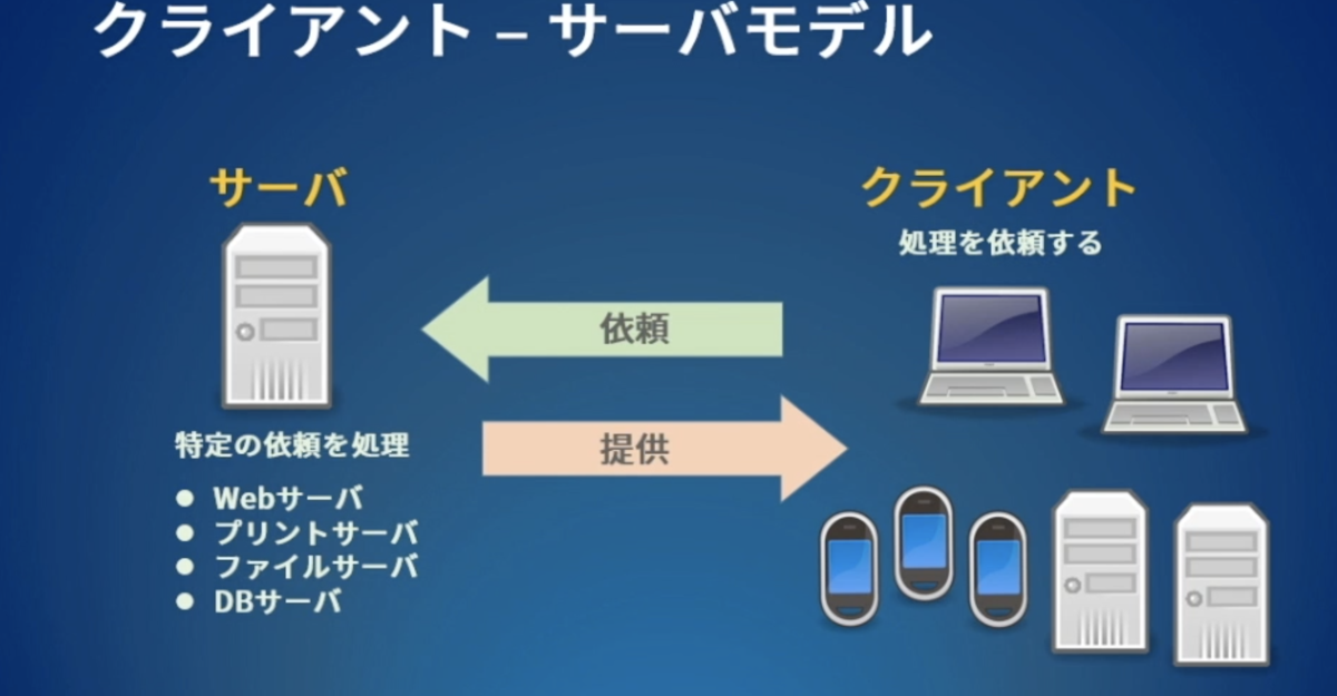 この「クライアント・サーバモデル」では、たくさんのクライアントに対して、少数のサーバで対応しています。Webサーバのほかにも、プリントサーバやファイルサーバなどもあります。クライアントは、ネットワーク上で必要なサーバを探して作業を依頼し、サーバ側は複数のクライアントからの依頼を処理します。