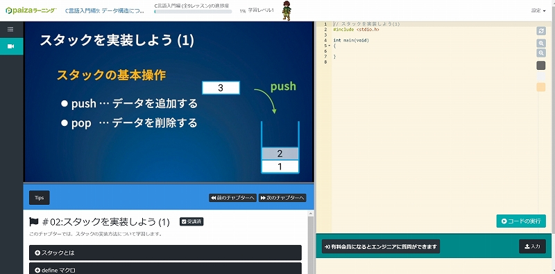 他にもスタックとキューや木構造、グラフなどのデータ構造がありますが、今回はその中でも基本となるスタックとキューについて学べる動画講座「C言語入門編9: データ構造について理解しよう」を紹介します。