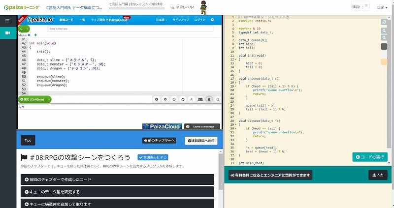 paizaラーニングではこの画面のように左側に学習動画、右側にエディタという構成になっているため、動画の説明を見てすぐにコードを書いて実行することができます。