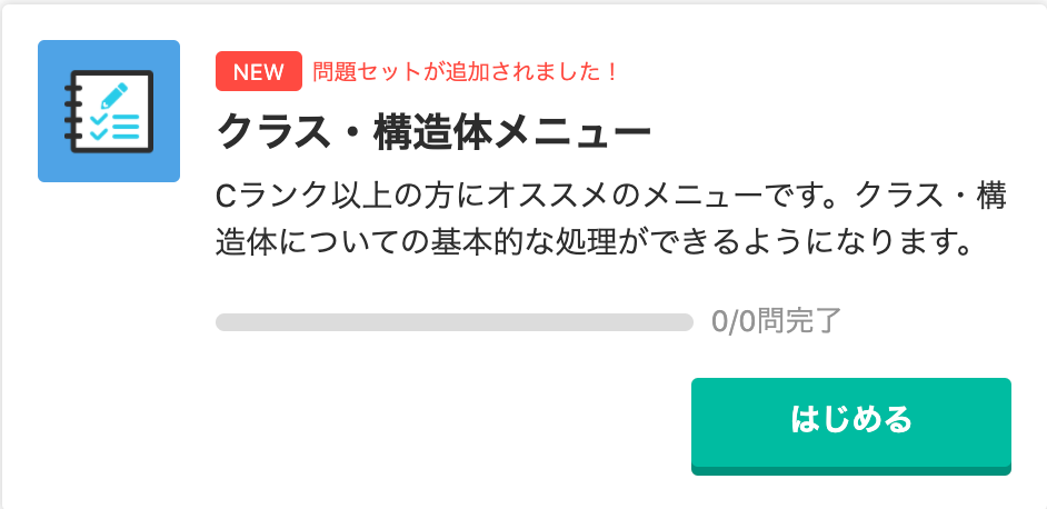 今回追加されたクラス・構造体メニューでは、その名の通り、クラスや構造体について学習することができます。なお現在は、C++の解答コード例を公開しています。今後他の言語の解答コード例も追加予定です。
