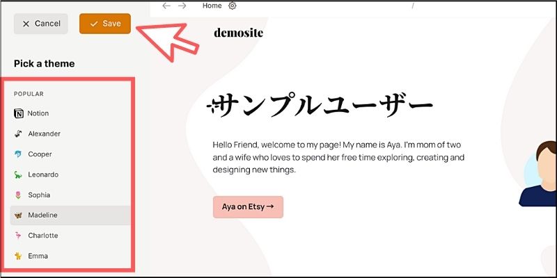 いくつかテーマが用意されており、選択するだけでNotionドキュメントがWebサイトのような見た目に変化します。