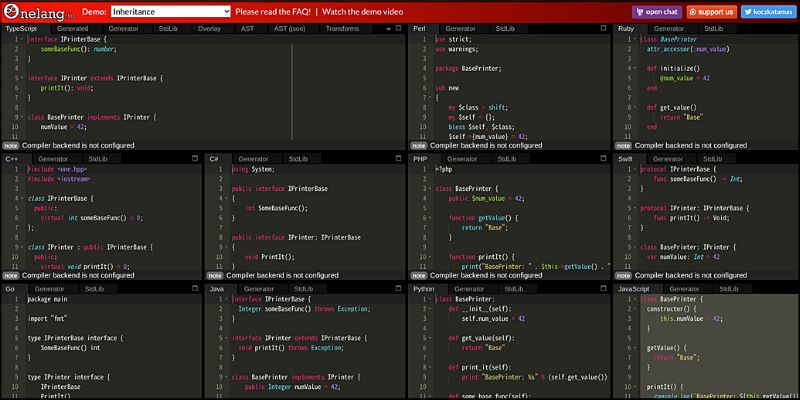 主要なプログラミング言語10種類のコードエディタが1つの画面に収められており、コードを書くと10種類の言語へ同時変換されるのが特徴です。