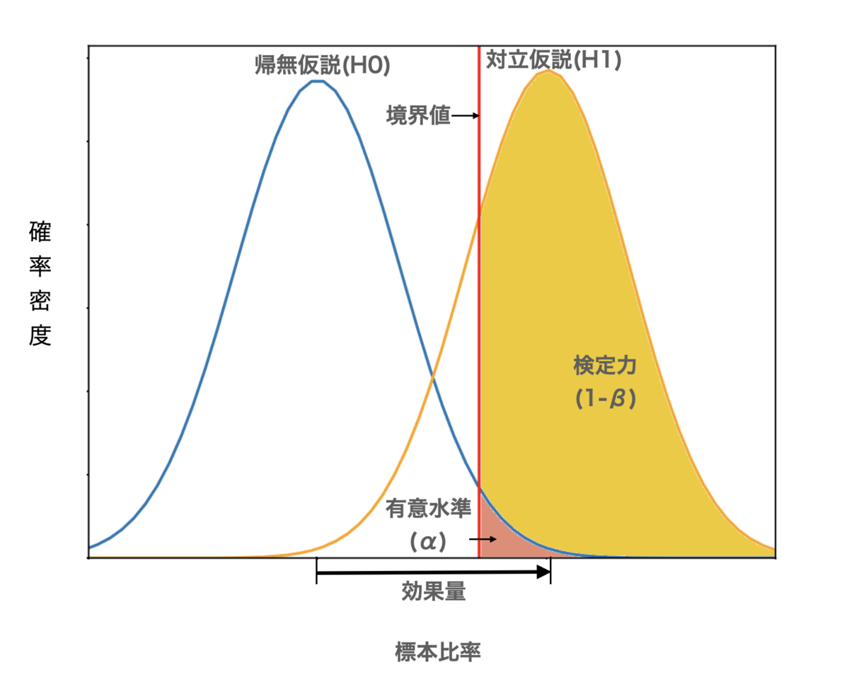 図で帰無仮説(H0)、対立仮説(H1)での標本比率の確率分布と、有意水準、効果量、境界値の関係を表すと、以下のようになります。