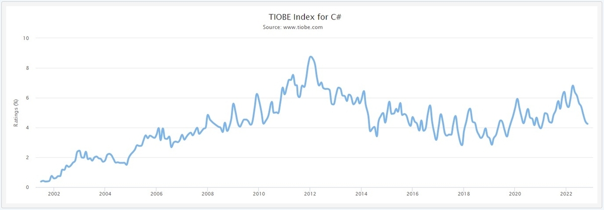 実はトップ10はほとんど順位が不動の言語で、C#は5位です。次にC#だけをフォーカスして見てみます。