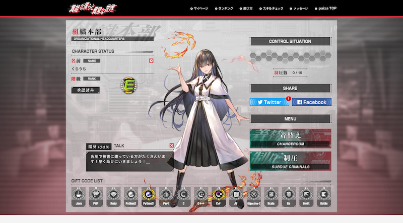 組織本部(マイページ)画面では、現在のステータスや着替え、制圧(プログラミング問題解答ページ)へのリンクが表示されています。