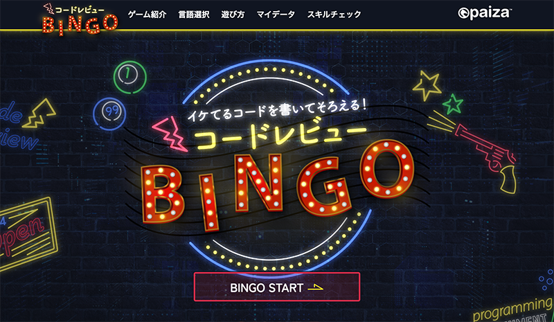 まずpaizaに無料会員登録※をしていただき、ログイン後『コードレビューBINGO!!』にアクセスして、BINGO STARTボタンをクリックしてください。