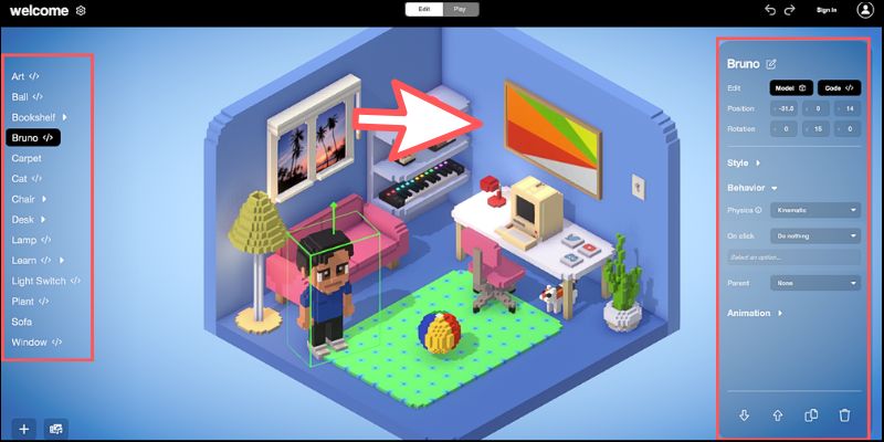 ユーザーはこの部屋の中に、多彩なオブジェクトを配置して部屋をカスタマイズできます。さらに、3Dオブジェクトをゼロから構築したり、コードを埋め込んでインタラクティブに実行させることもできるわけです。