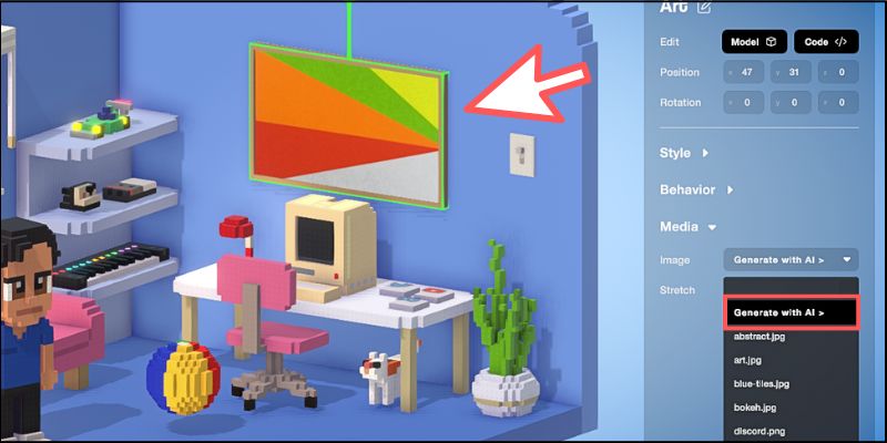 たとえば、壁に配置されている絵を別の画像に差し替えてみましょう。絵のオブジェクトを選択状態にして、右側のパネルから「Media」→「Image」を選択します。
