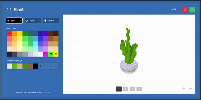 プレビュー画面は3Dキャンバスになっており、ボクセル形式のブロックを足したり削除したりするだけなので作業は簡単です。