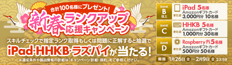 ただいまpaizaのスキルチェックでプログラミング問題を解くと、抽選でiPadやHHKB、Raspberry Pi(ラズパイ)が当たるキャンペーンを実施中です。