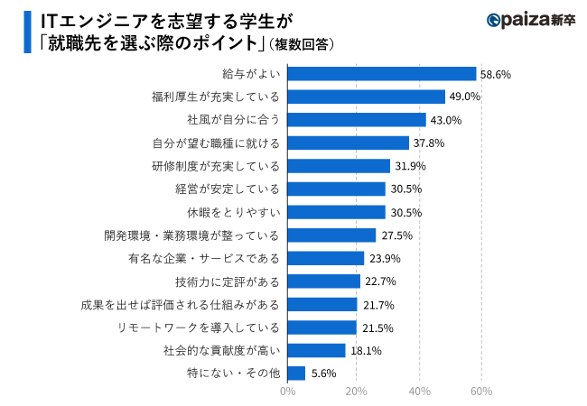 エンジニアを目指す学生特有の項目としては、「自分が望む職種に就ける」(4位)、「研修制度が充実している」(5位)、「開発環境・業務環境が整っている」(8位)などがあり、自分のスキルを向上させやすい環境が重視されていることがわかります。