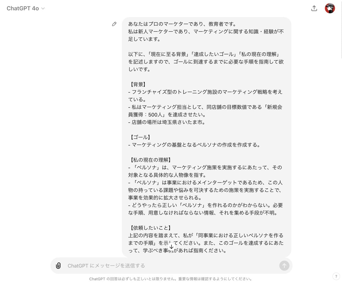 ChatGPTに対して、まずは自分の現状についてインプットします。「背景」「現在の状況」「達成したいゴール」「自分の考えや仮説」などの詳細を伝えます。そして次に「ゴールを達成するために必要な手順」「自分の理解で誤っている点の指摘」「自分が学ぶべき事柄」が何かを示すように依頼します。