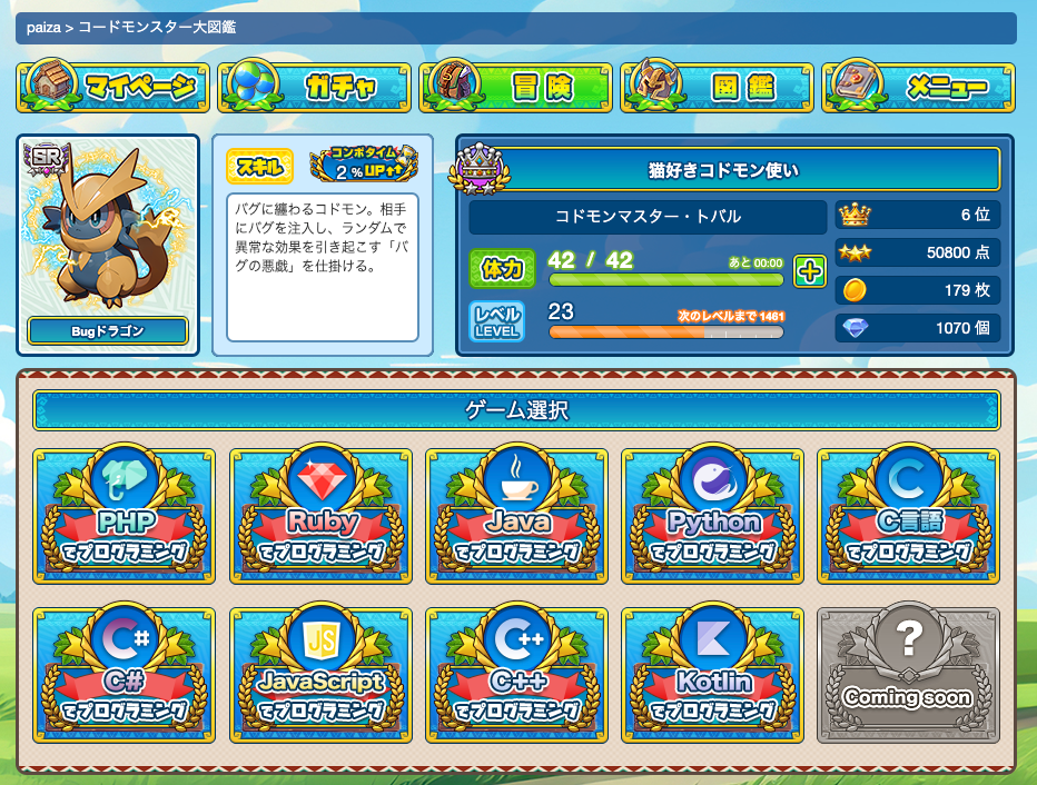プログラミング問題を解いてストーリーを進めたり、ガチャを回してモンスターを集めたりする学習ゲームです。冒険を進めながらプログラミングスキルを身につけて、新しいモンスターを捕まえよう!