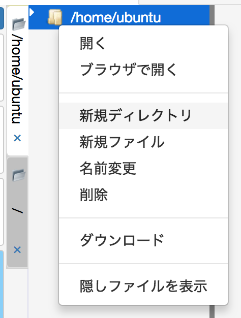 画面左側のファイルファインダで、ホームディレクトリ("/home/ubuntu")を右クリックし、「新規ディレクトリ」を選び、"views"というディレクトリを作成します。